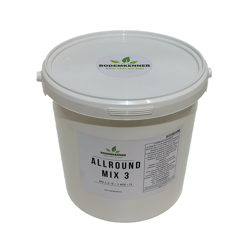 Bij Bodemkenner begrijpen we hoe belangrijk het is om je bodem en planten goed voor te bereiden op de koude maanden. Allround Mix 3 is een zorgvuldig samengestelde, organische najaarsmeststof met een uitgebalanceerde samenstelling: NPK 5-5-18 + 2 MgO + Fe. Deze mix is speciaal ontwikkeld om je tuin of gewassen winterklaar te maken en de bodemkwaliteit te verbeteren.